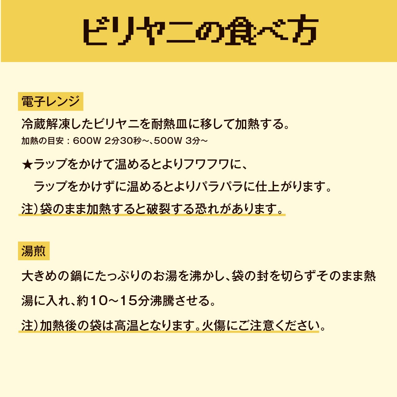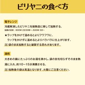 冷蔵解凍したビリヤニを耐熱皿に移して加熱する。※袋のまま加熱すると破裂する恐れがあります。