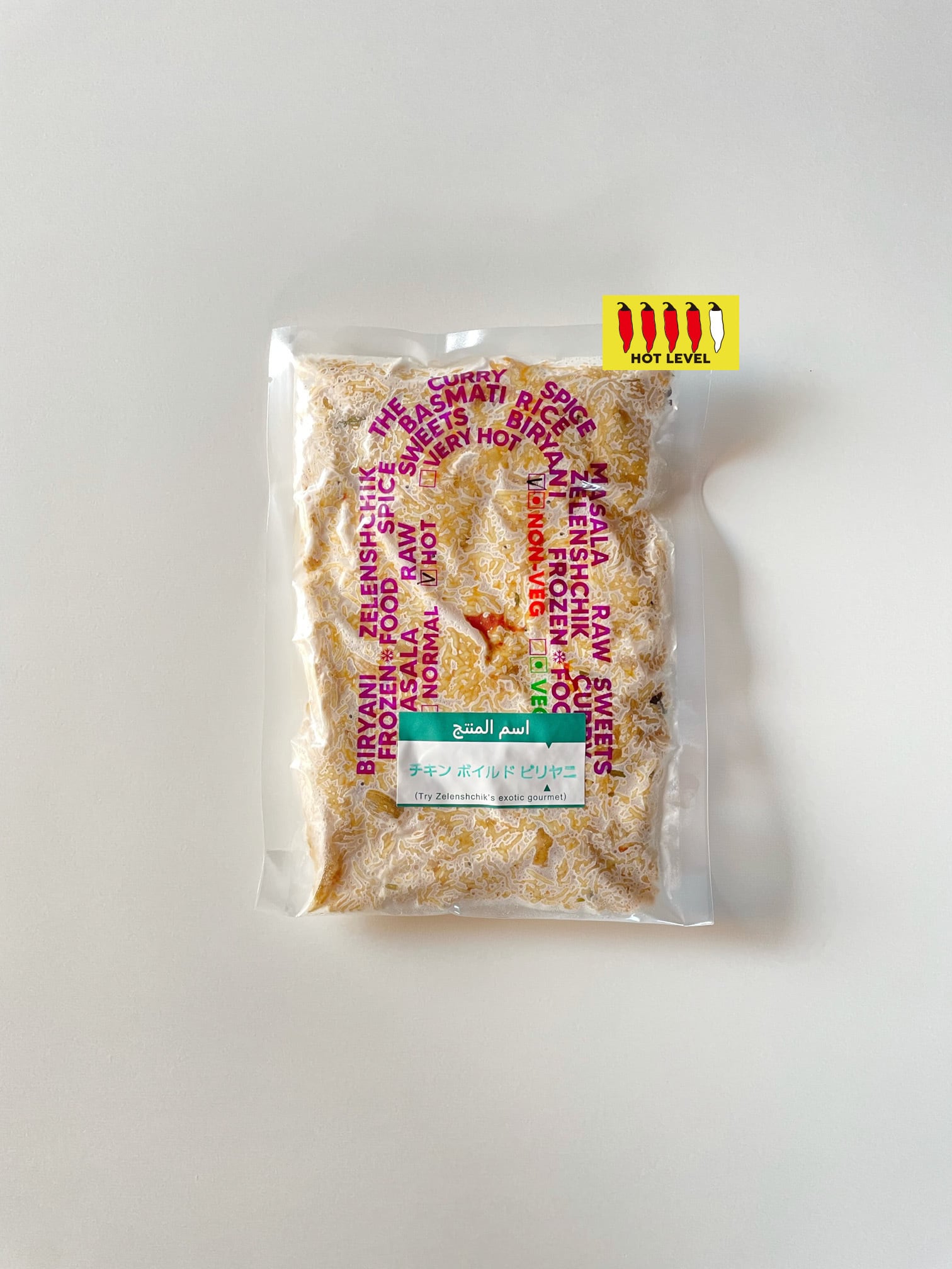 原材料:米(インド産)、鶏肉、玉ねぎ、有機トマト・ジュースづけ(有機トマト、有機トマトジュース)、発酵乳、植物油、ギー、香菜、天日塩、香辛料、にんにく、しょうが、唐辛子、ココナッツファイン、ミント、アダン抽出液、(一部に乳成分・鶏肉を含む)